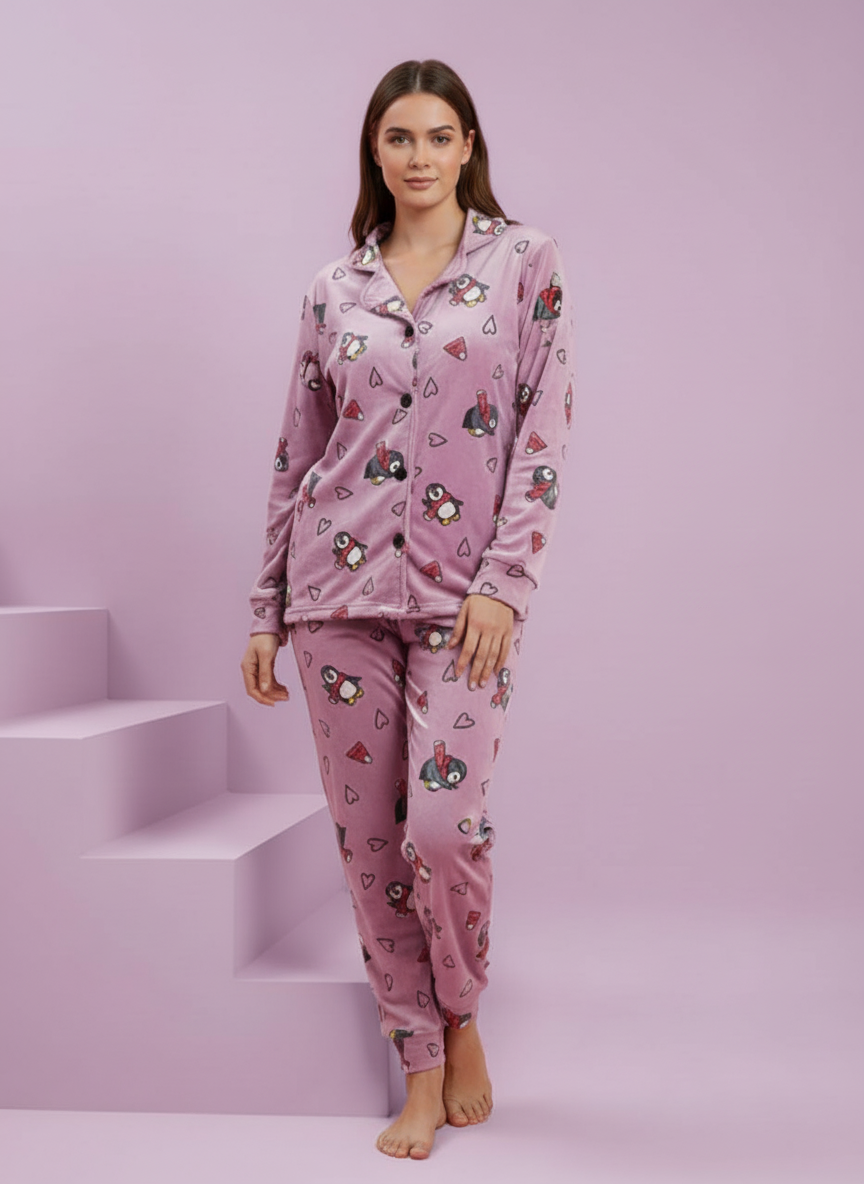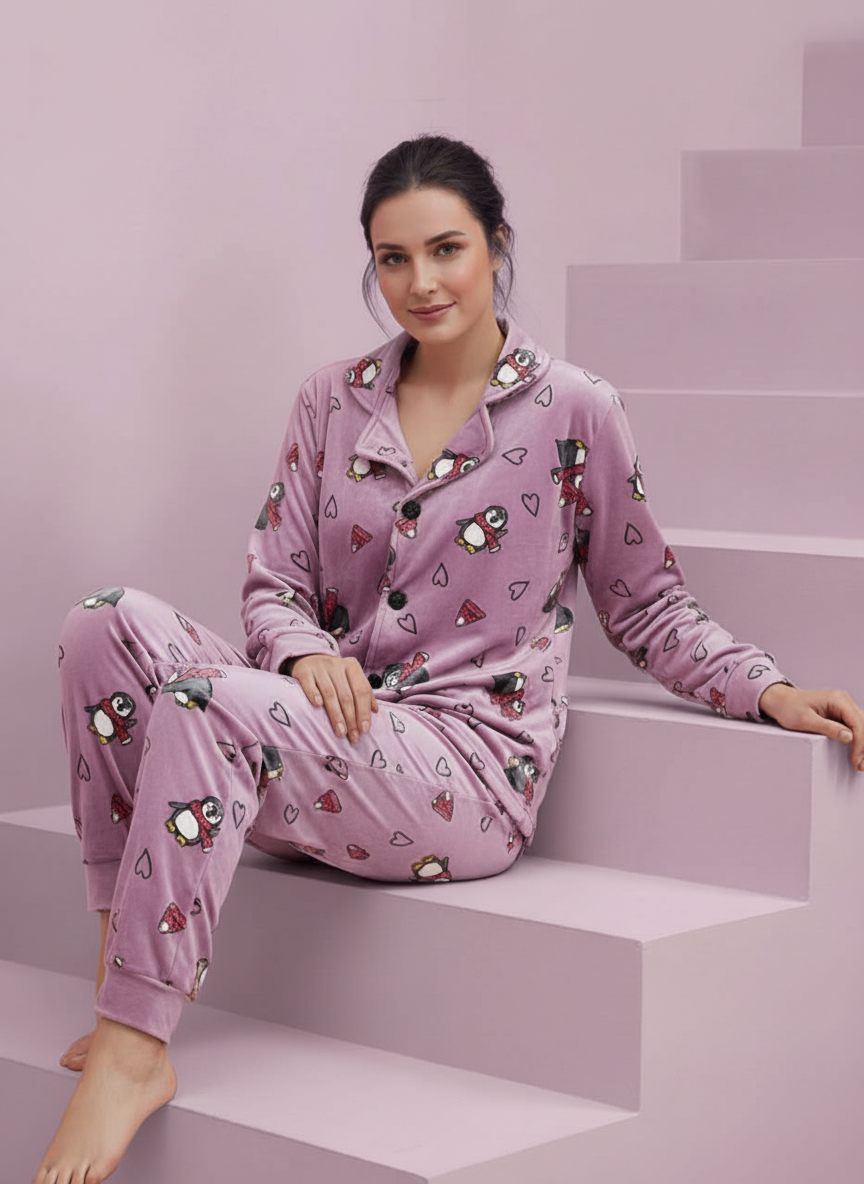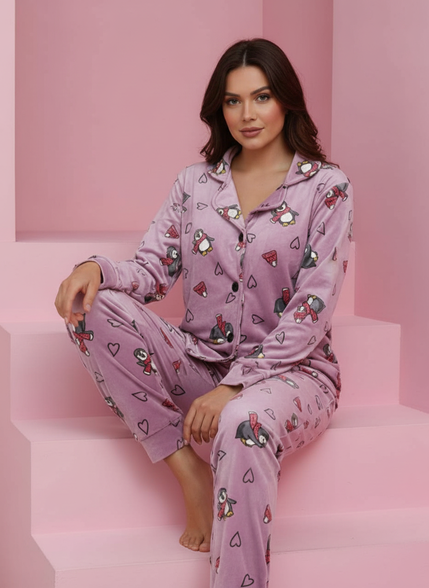 استمتعي بالدفء والنعومة في أمسيات الشتاء مع هذه البيجاما النسائية الرقيقة بلون بنفسجي فاتح وطبعات بطاريق لطيفة وقلوب تضيف لمسة مرحة وجذابة لإطلالتك المنزلية.