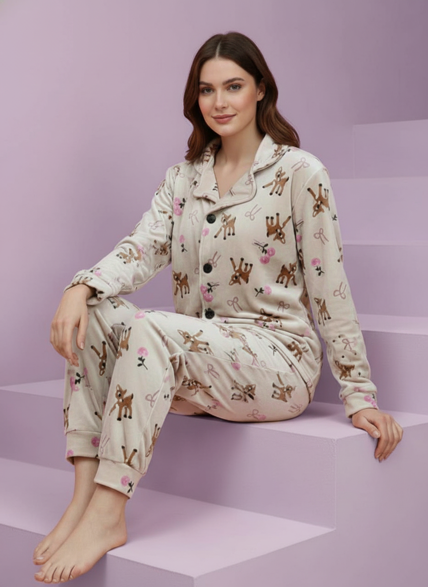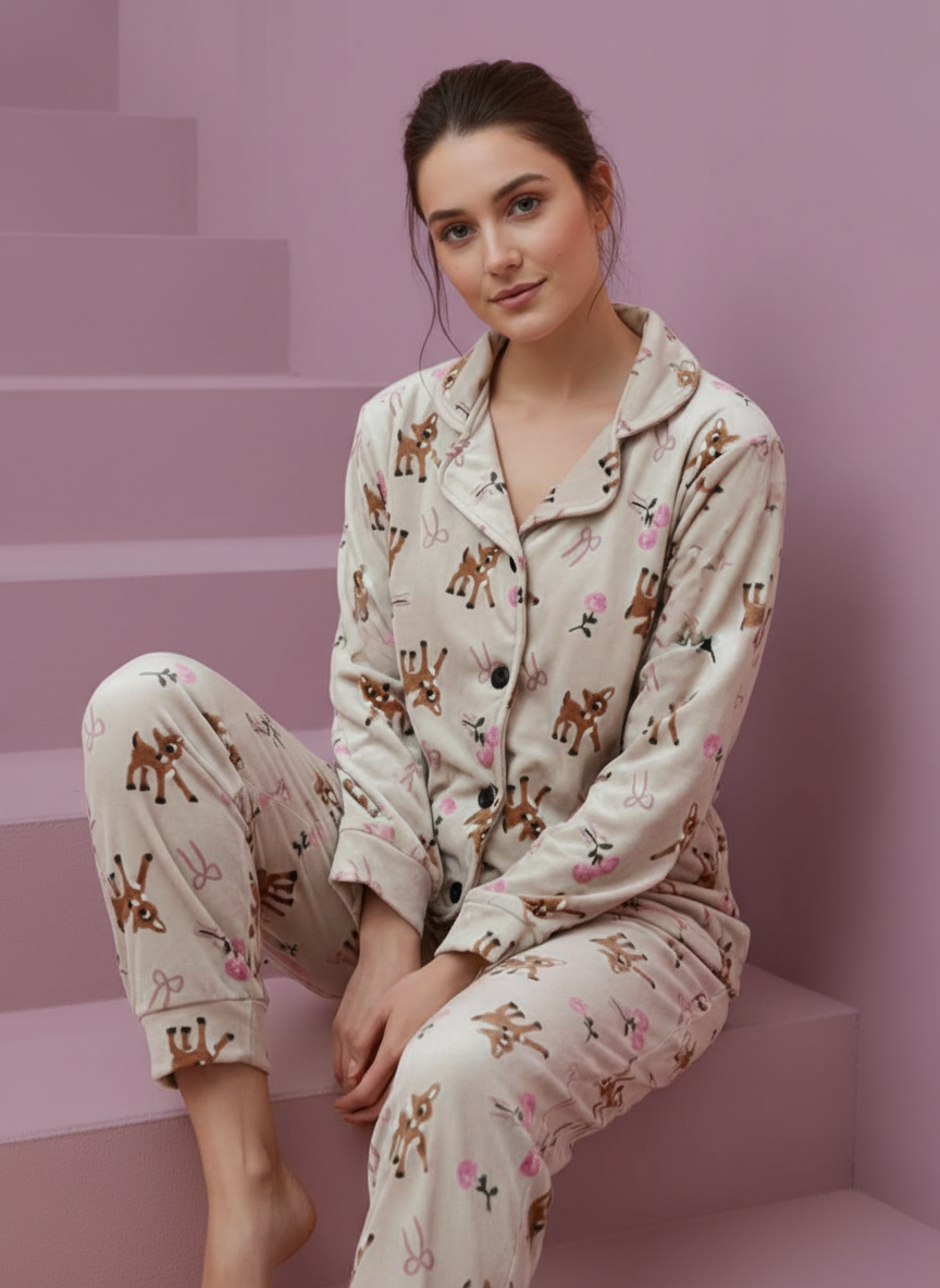 دلّلي نفسك بالدفء والنعومة مع هذه البيجاما النسائية الأنيقة بلون بيج فاتح مع طبعة غزلان وزهور وردية تضيف لمسة لطيفة إلى إطلالتك المنزلية.