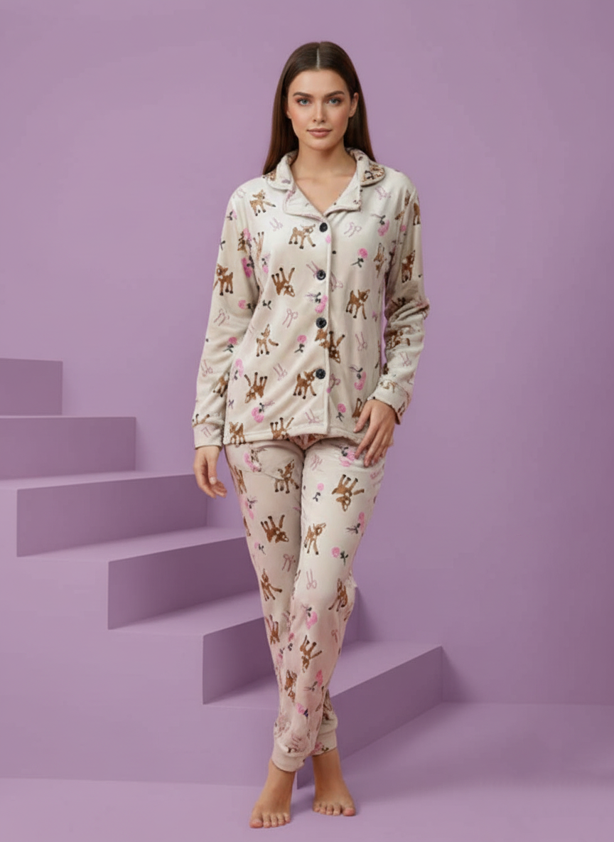 بيجامة حريمي شتوية بطبعة غزلان وزهور وردية – لون بيج
