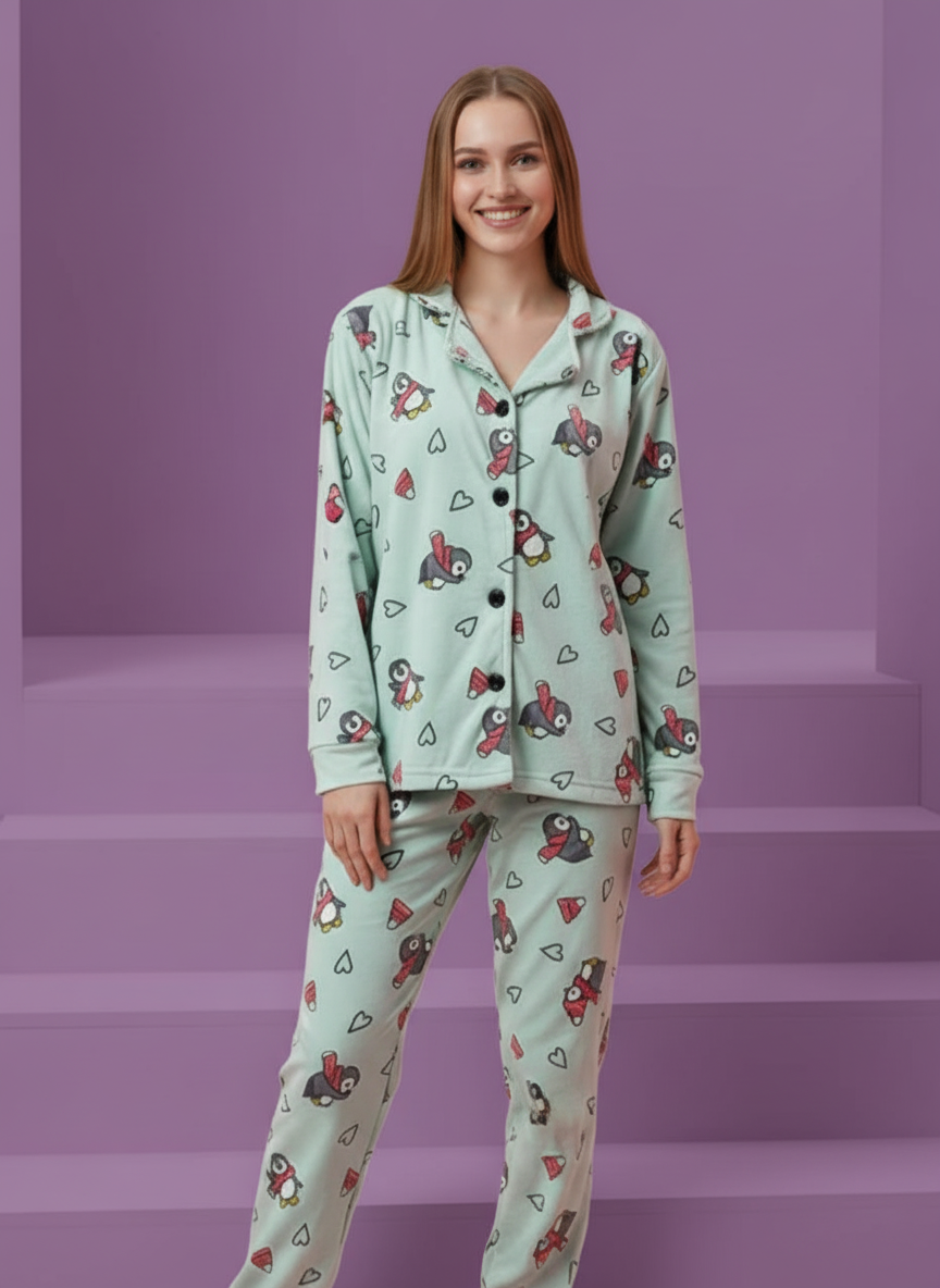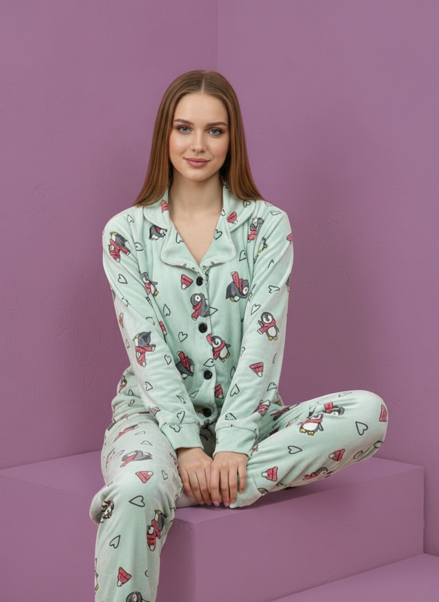 بيجامة حريمي قطيفة بطبعة بطاريق – لون أخضر فاتح