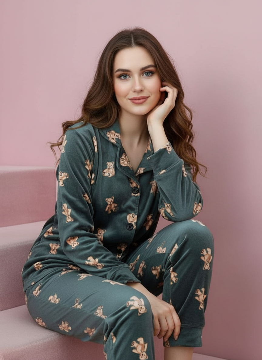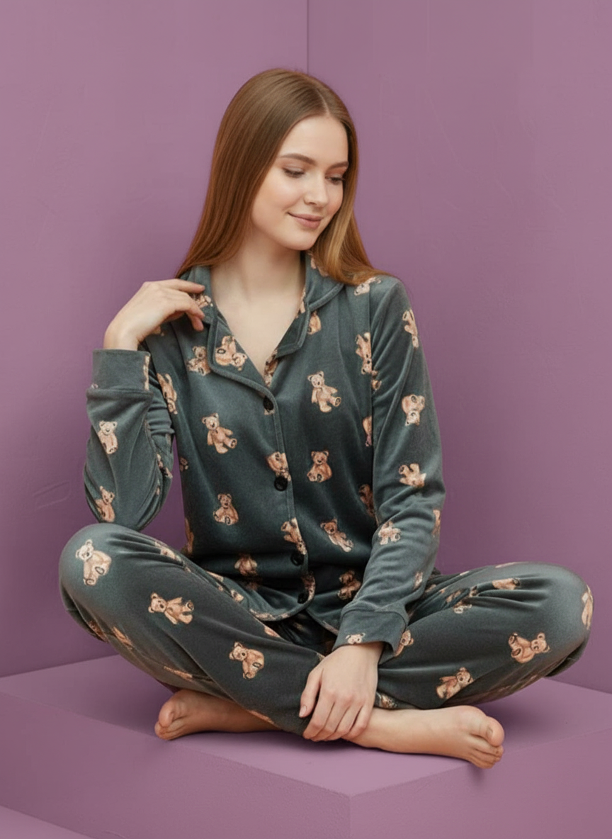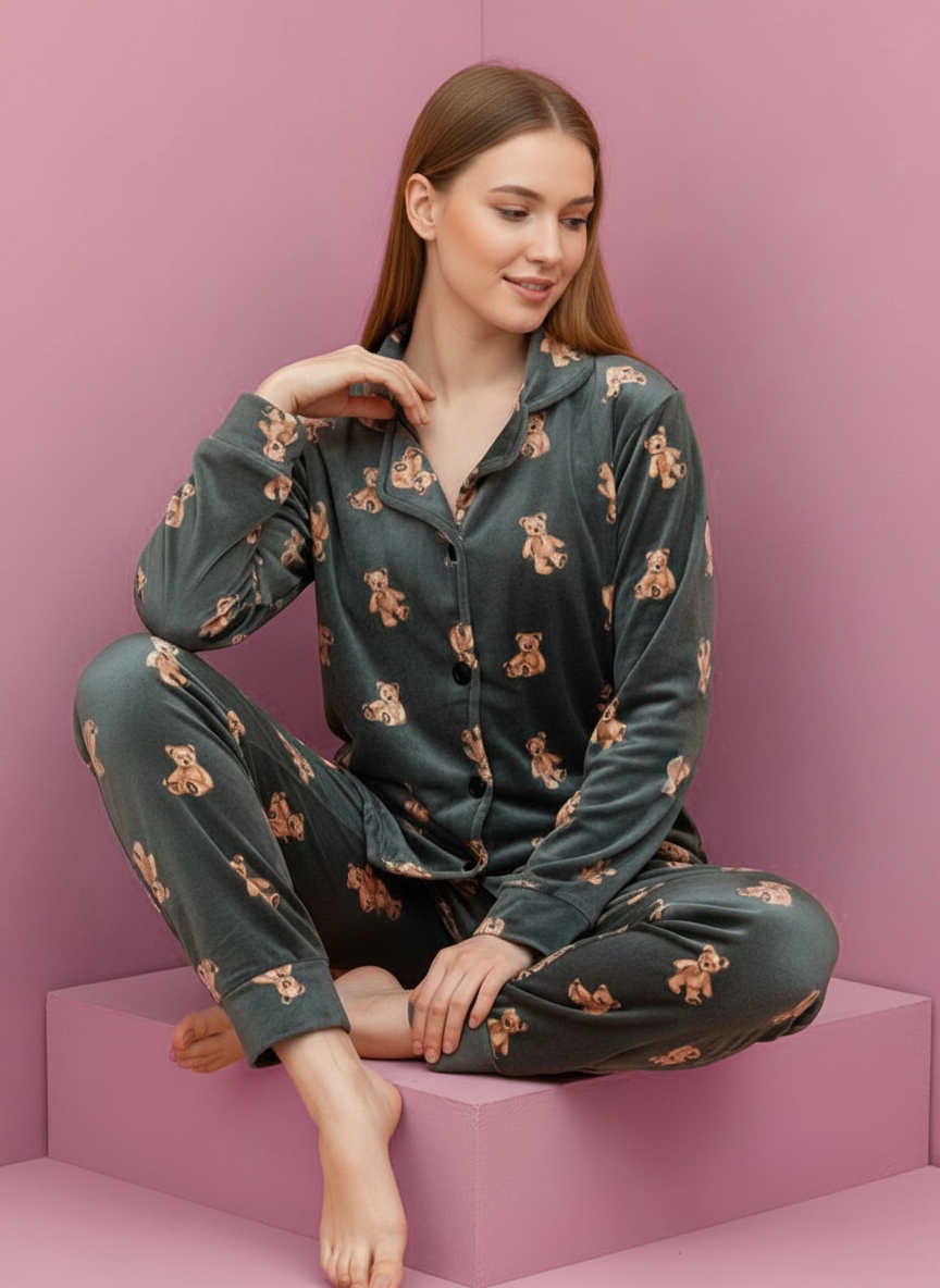بيجامة حريمي قطيفة بطبعة دباديب – لون رصاصي غامق
