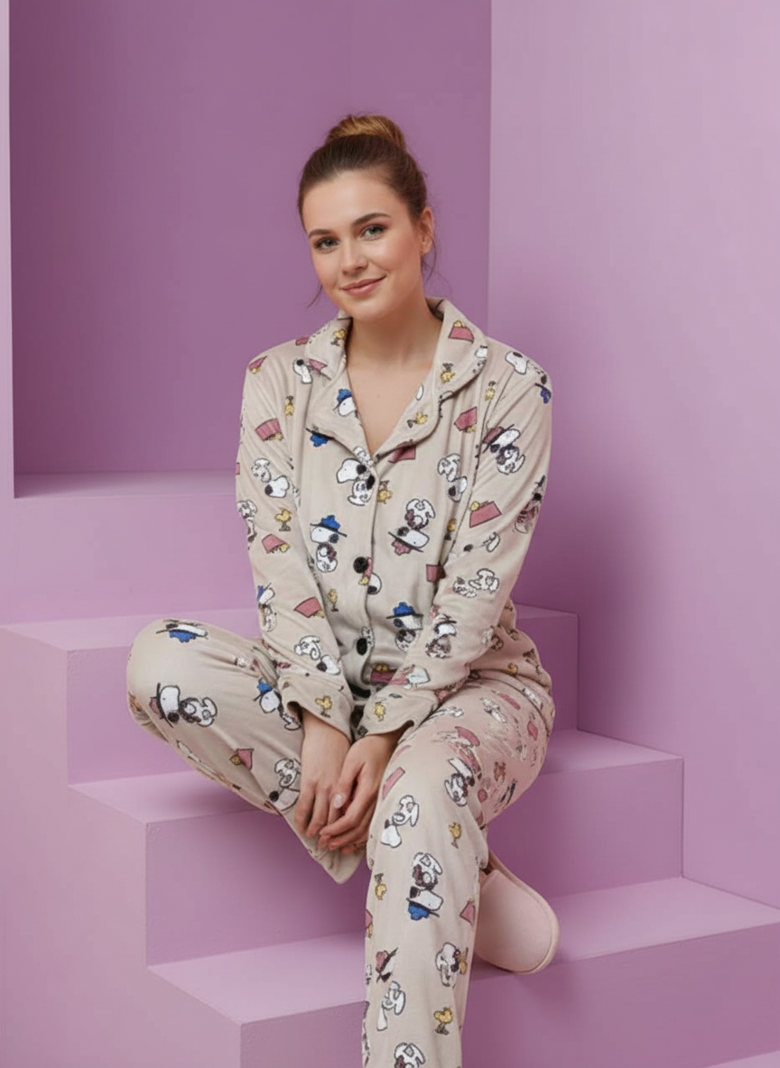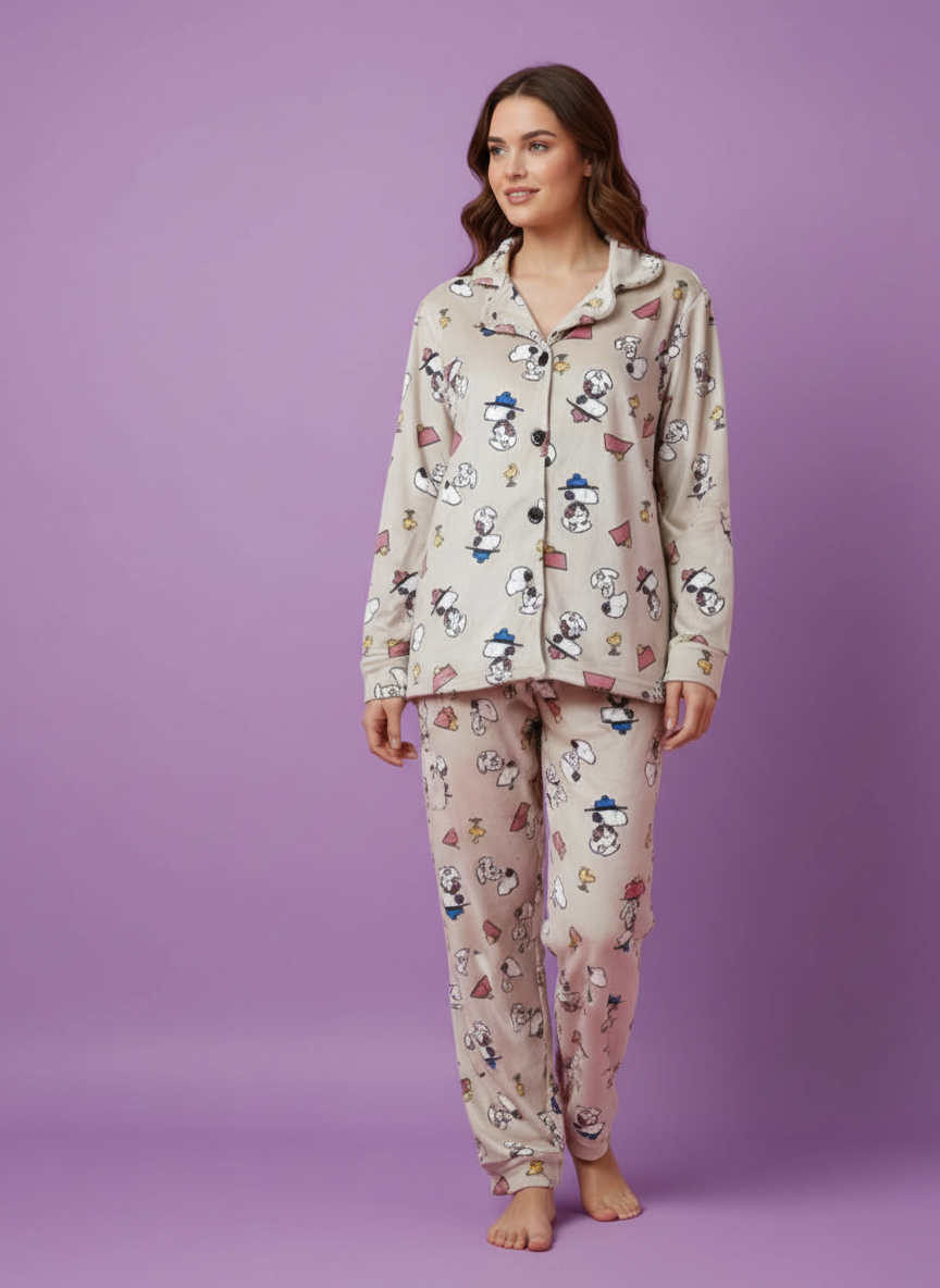 بيجامة حريمي قطيفة بطبعة سنوبي – لون بيج ناعم
