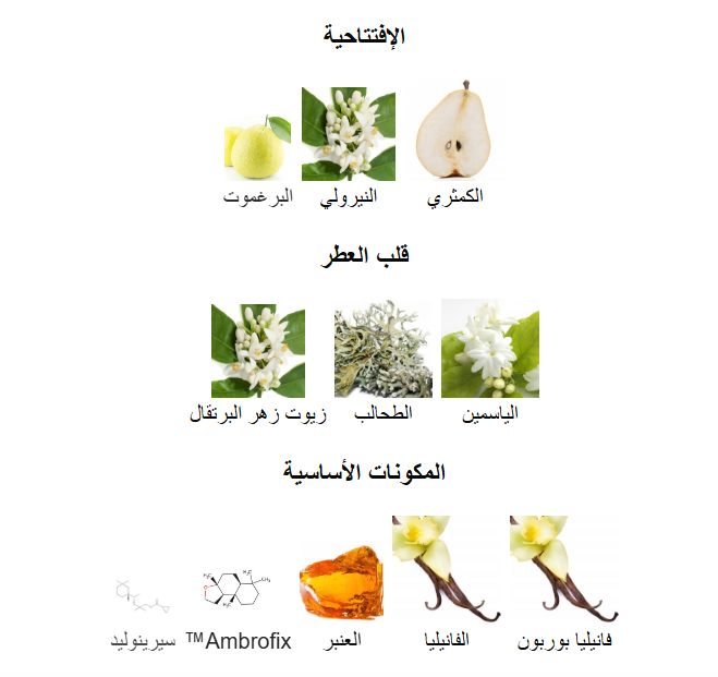 عطر شرقي زهري نسائي يعكس قوة الأنوثة العصرية وسحرها الغامض. يفتتح برائحة مشرقة من الكمثرى، النيرولي والبرغموت، ثم يكشف عن قلب أنيق من الياسمين، الطحالب وزيوت زهر البرتقال، ليستقر في النهاية على قاعدة دافئة من فانيليا بوربون والفانيليا مع لمسات غنية من العنبر.